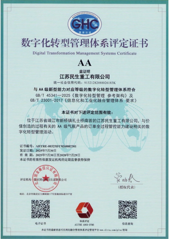 近日,江蘇民生重工有限公司(以下簡(jiǎn)稱“民生重工”)順利通過了工業(yè)和信息化部?jī)苫诤瞎芾眢w系評(píng)定工作委員會(huì)的審核,榮獲《兩化融合管理體系A(chǔ)A級(jí)評(píng)定證書》及《數(shù)字化轉(zhuǎn)型管理體系A(chǔ)A級(jí)評(píng)定證書》。此次雙認(rèn)證標(biāo)志著民生重工在智能制造與信息化深度融合領(lǐng)域?qū)崿F(xiàn)里程碑式突破,為民生重工數(shù)字化轉(zhuǎn)型和管理體系的提質(zhì)增效提供了實(shí)踐范本。
